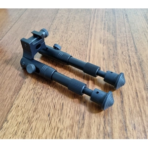The stand measures about 180mm in overall max height with some height adjustment in the legs. Legs can be folded up to stow away. Attaches via Picatinny rail. Metal construction. Works great on the Kunlun and Harrier blaster or any blaster with underside picatinny rail. See photos!